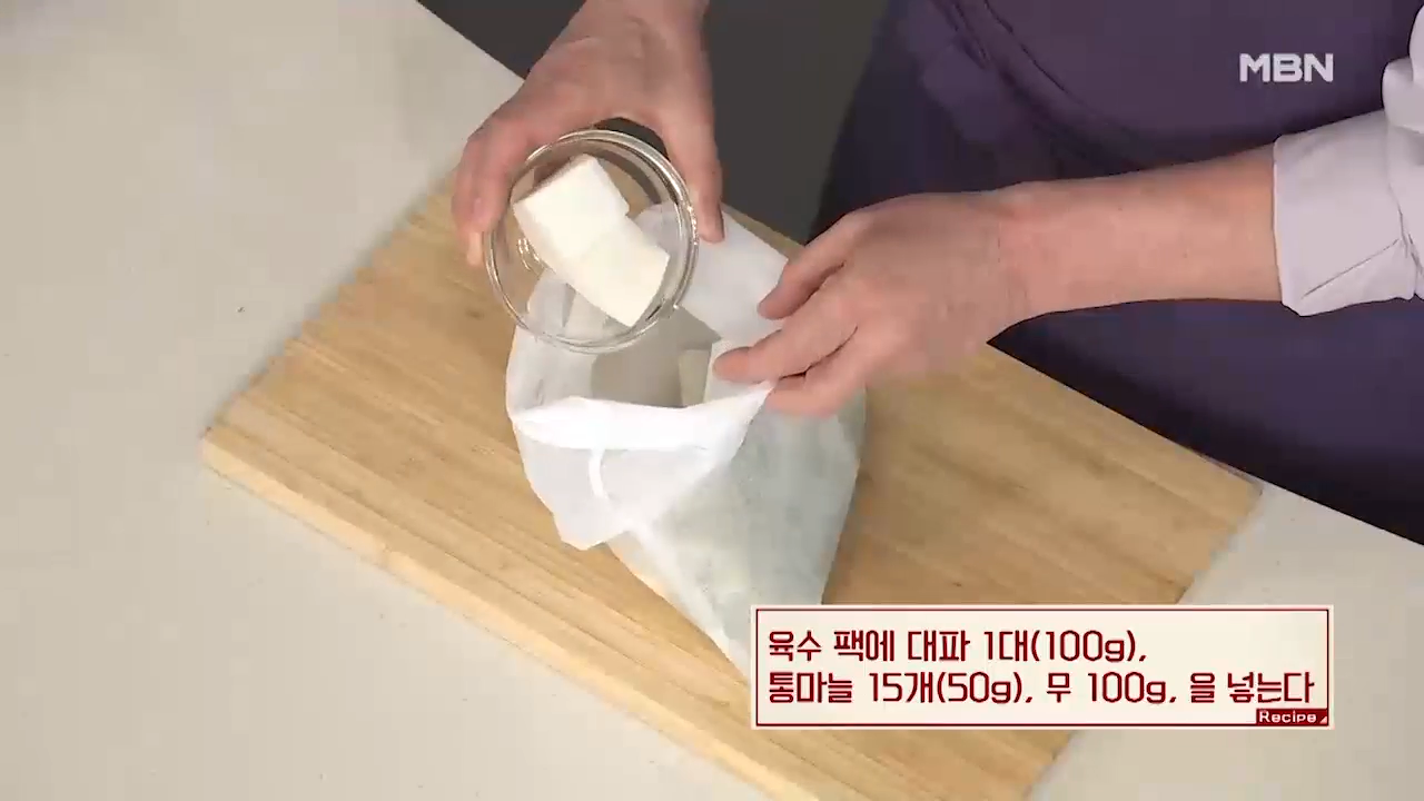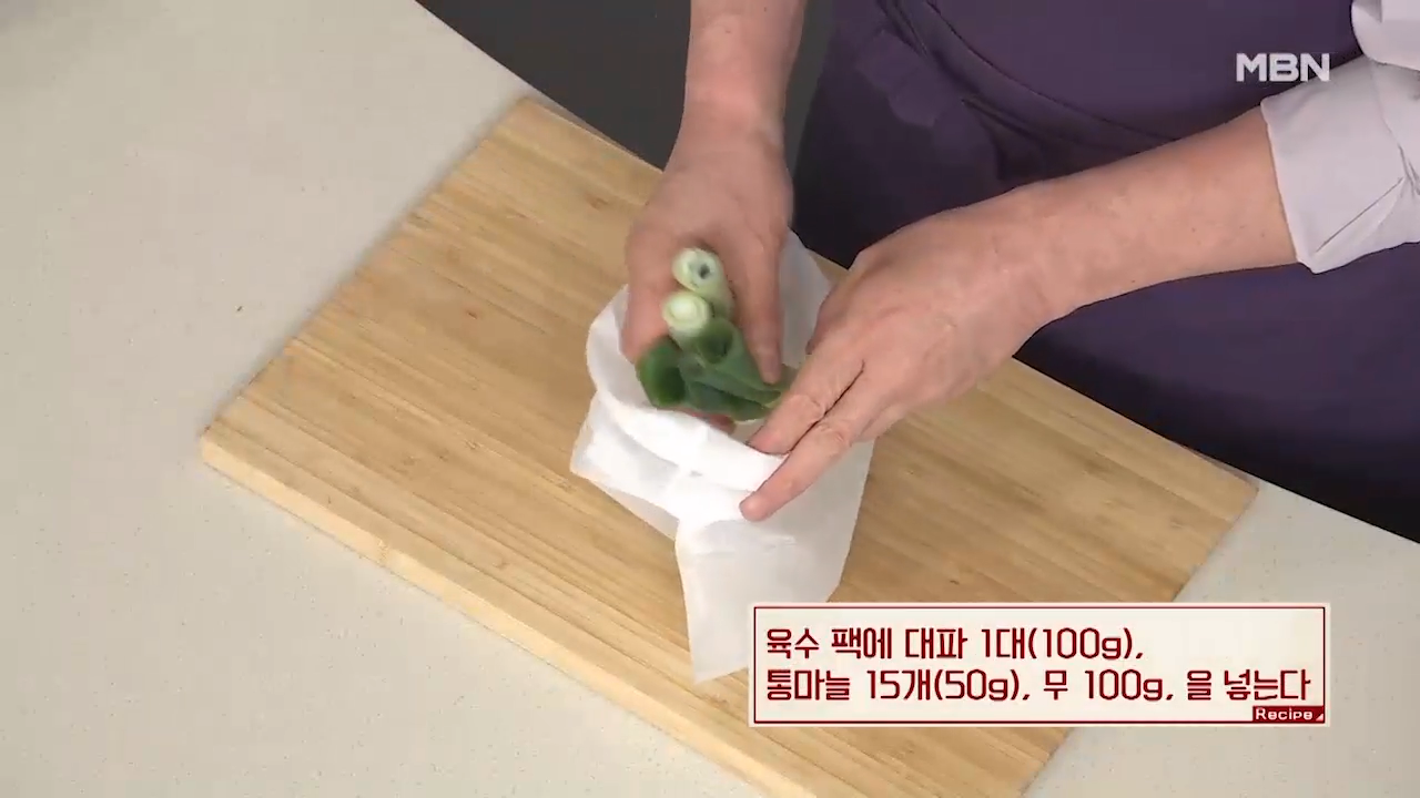 ▶육수 팩에 대파 1대(100g)를 넣어줍니다.