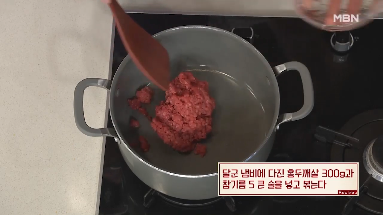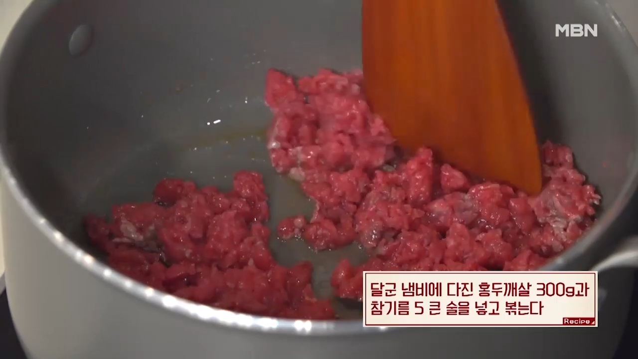 ▶달군 냄비에 다진 홍두깨살 300g과 참기름 5큰술을 넣고 볶아줍니다.