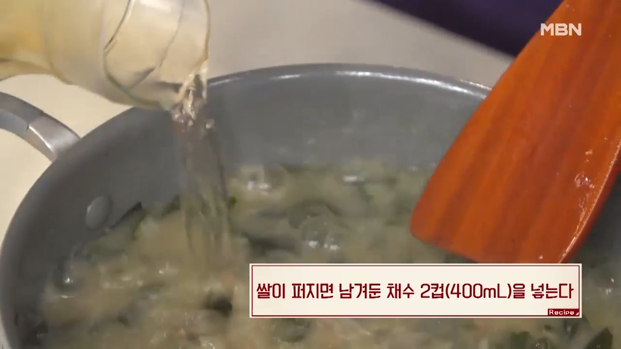 ▶쌀이 퍼지면 남겨둔 채수 2컵(400mL)을 넣어줍니다.