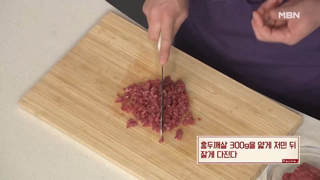 ▶홍두깨살 300g을 얇게 저민 뒤 잘게 다진다.