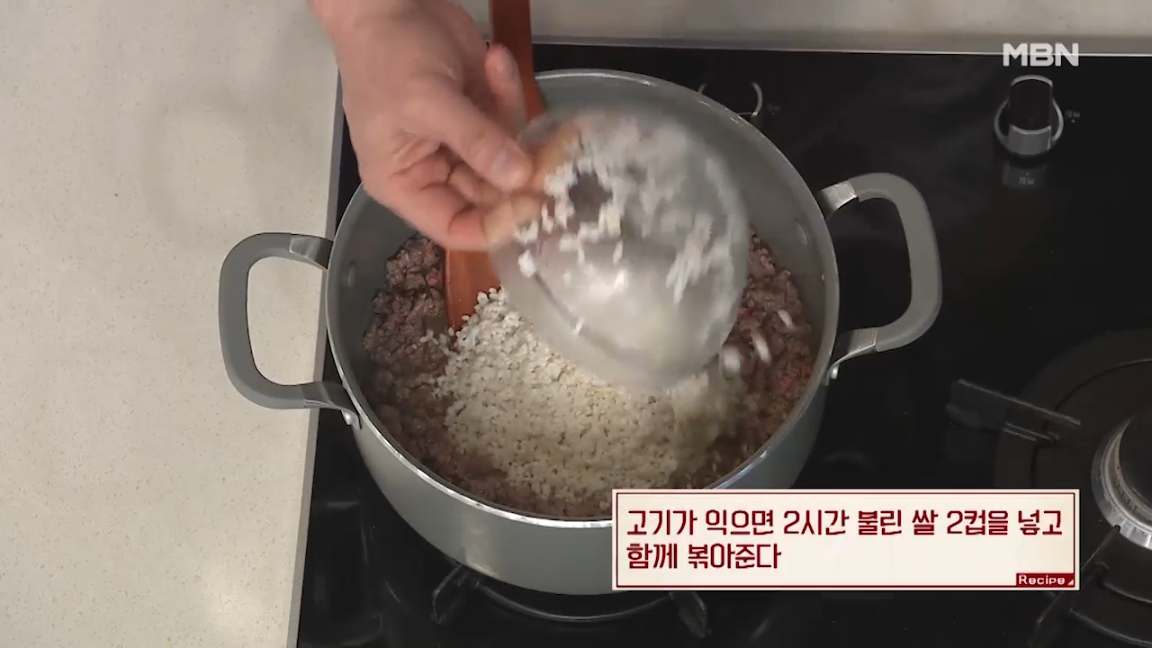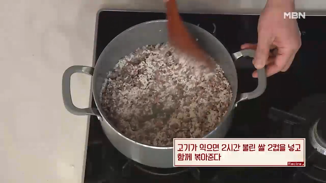▶고기가 익으면 2시간 불린 쌀 2컵을 넣고 함께 볶아줍니다.