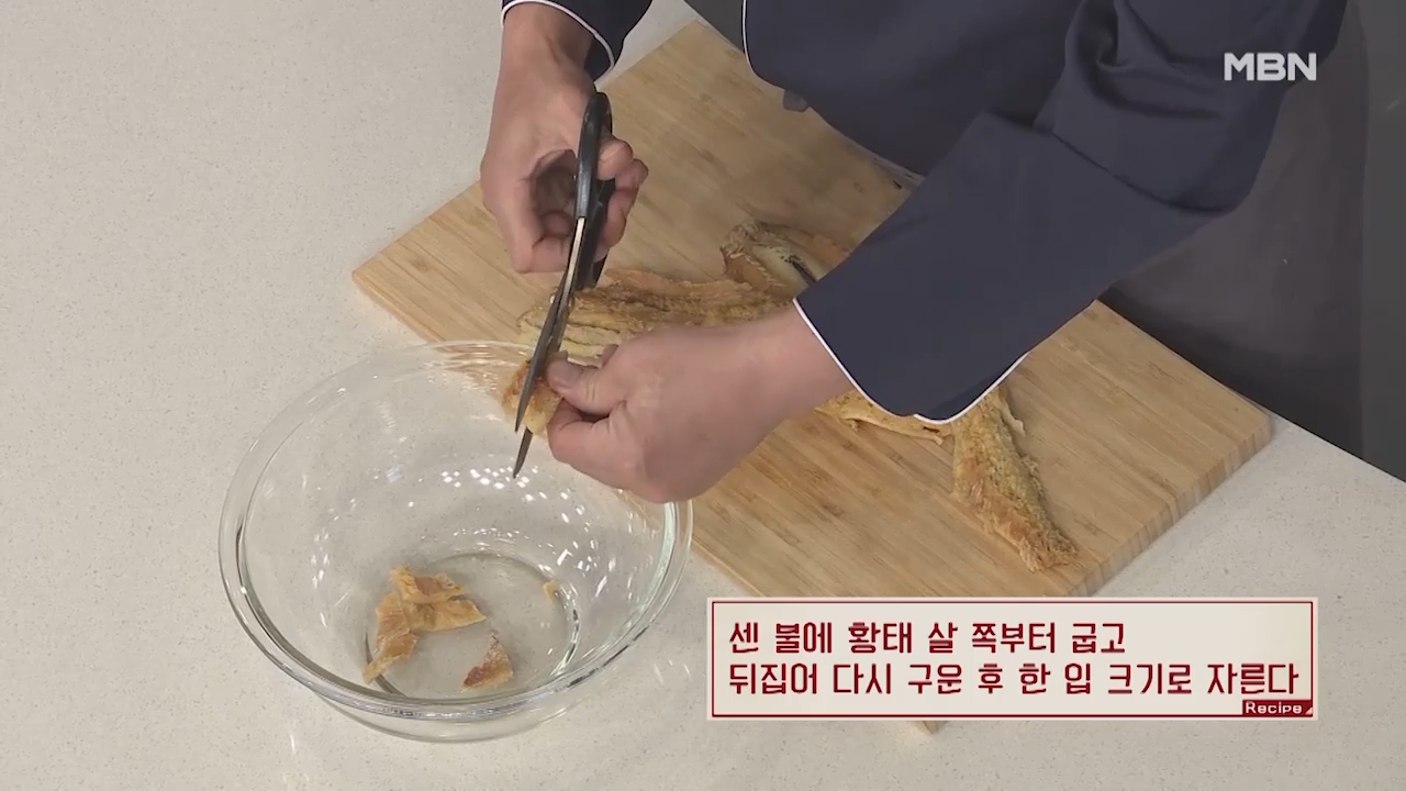 ▶구운 황태는 한 입 크기로 잘라줍니다.