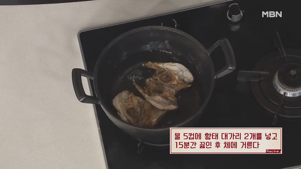 ▶물 5컵에 황태 대가리 2개를 넣고 15분간 끓여줍니다.