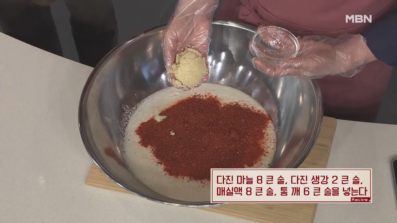 ②고운 고춧가루 1컵, 굵은 고춧가루 1컵, 다진 마늘 8큰술, 다진 생강 2큰술, 매실액 8큰술, 통깨 6큰술, 편으로 썬 밤 30알 넣기