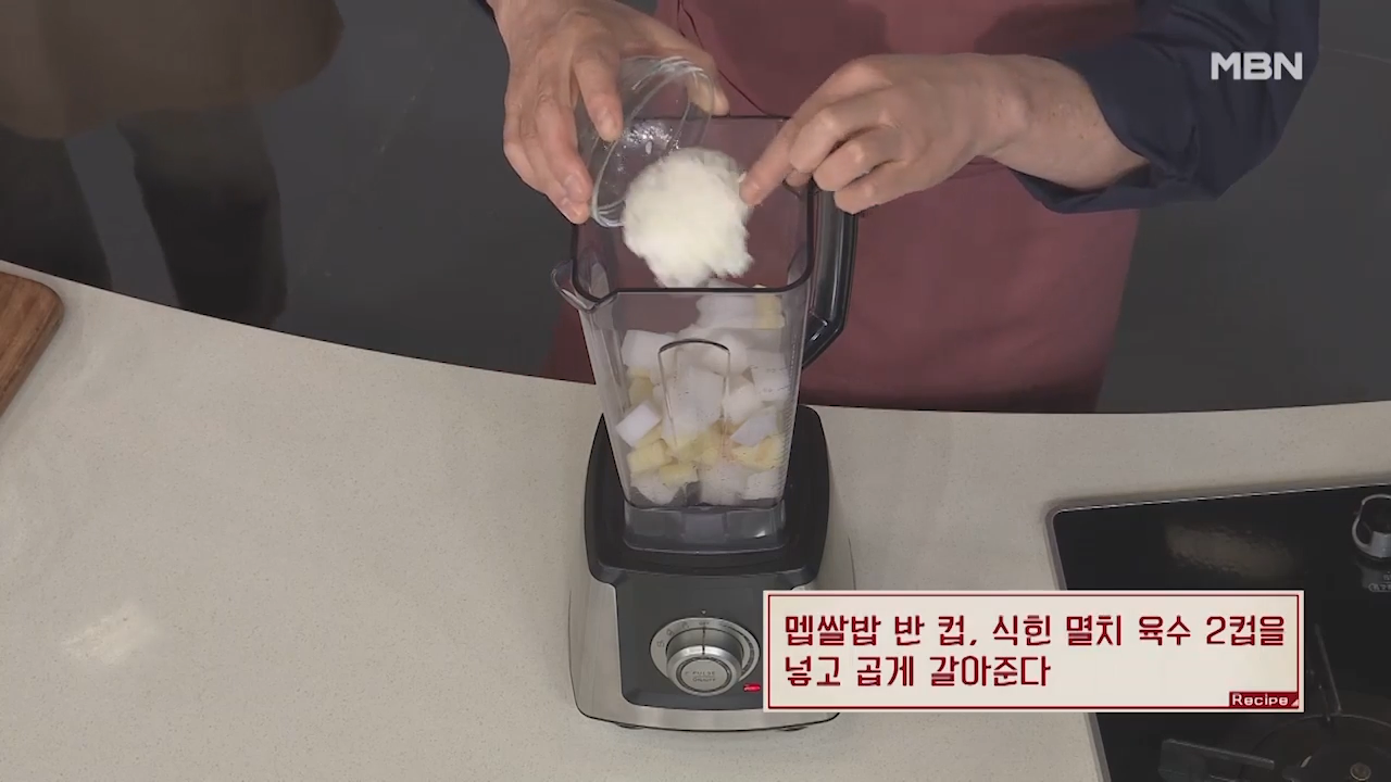 ▶재료들이 잘 갈리도록 식힌 멸치 육수 2컵을 넣어줍니다.